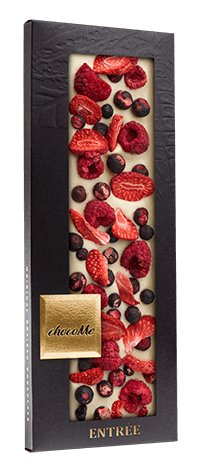 Bílá čokoláda s černým rybízem, plátky jahod a celými malinami
