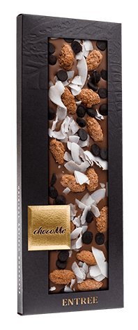 Mléčná čokoláda s mandlemi v cukru a skořici, plátky kokosu a pastilkami hořké čokolády