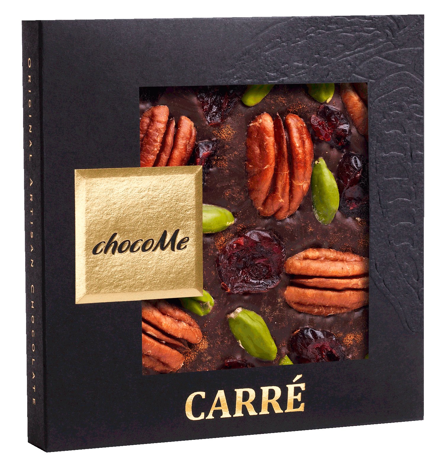 Hořká čokoláda se skořicí, brusinkami, pistáciemi a pekanovými ořechy