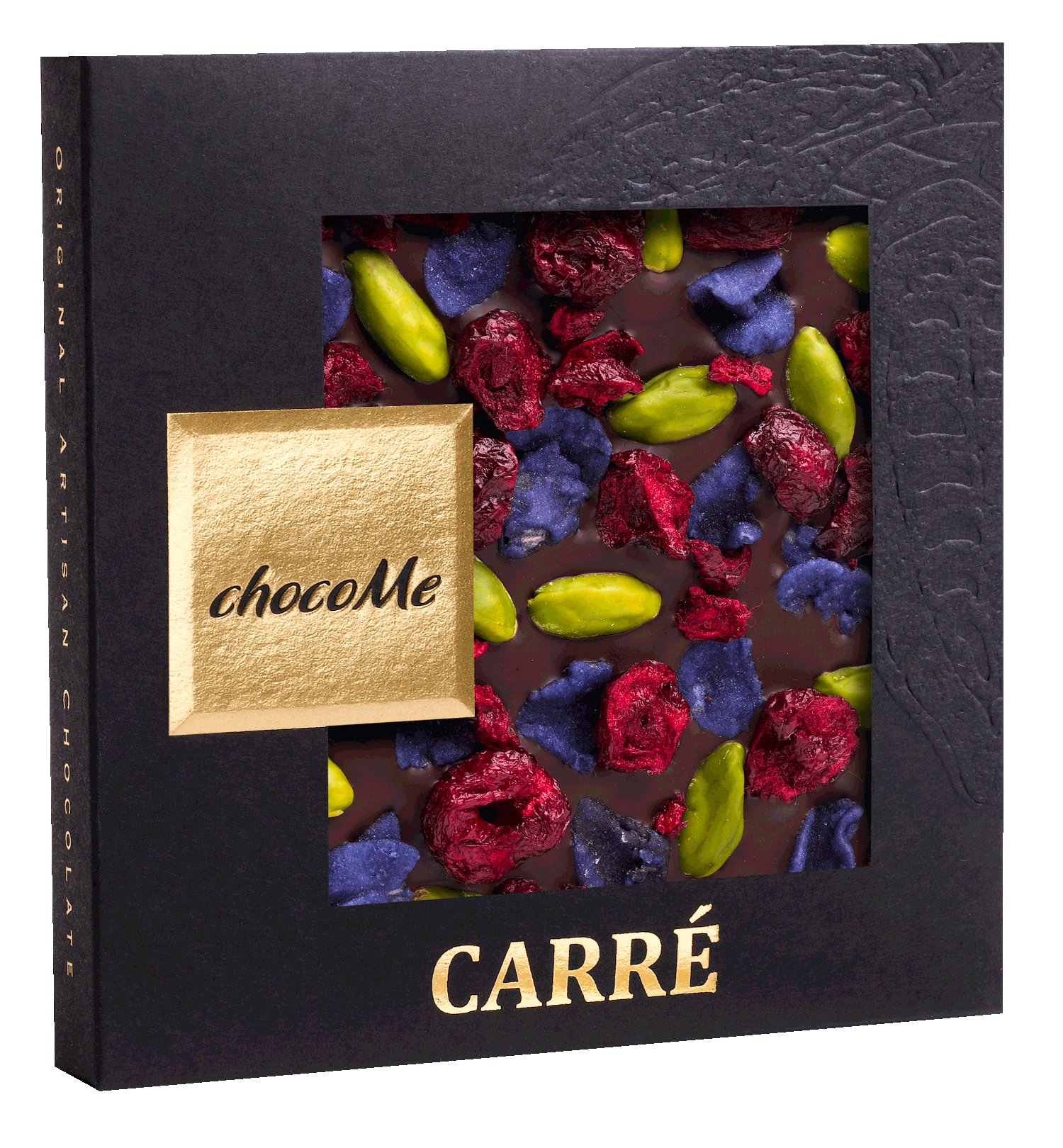 Hořká čokoláda s kandovanými lístky fialek, pistáciemi z Bronte a višněmi