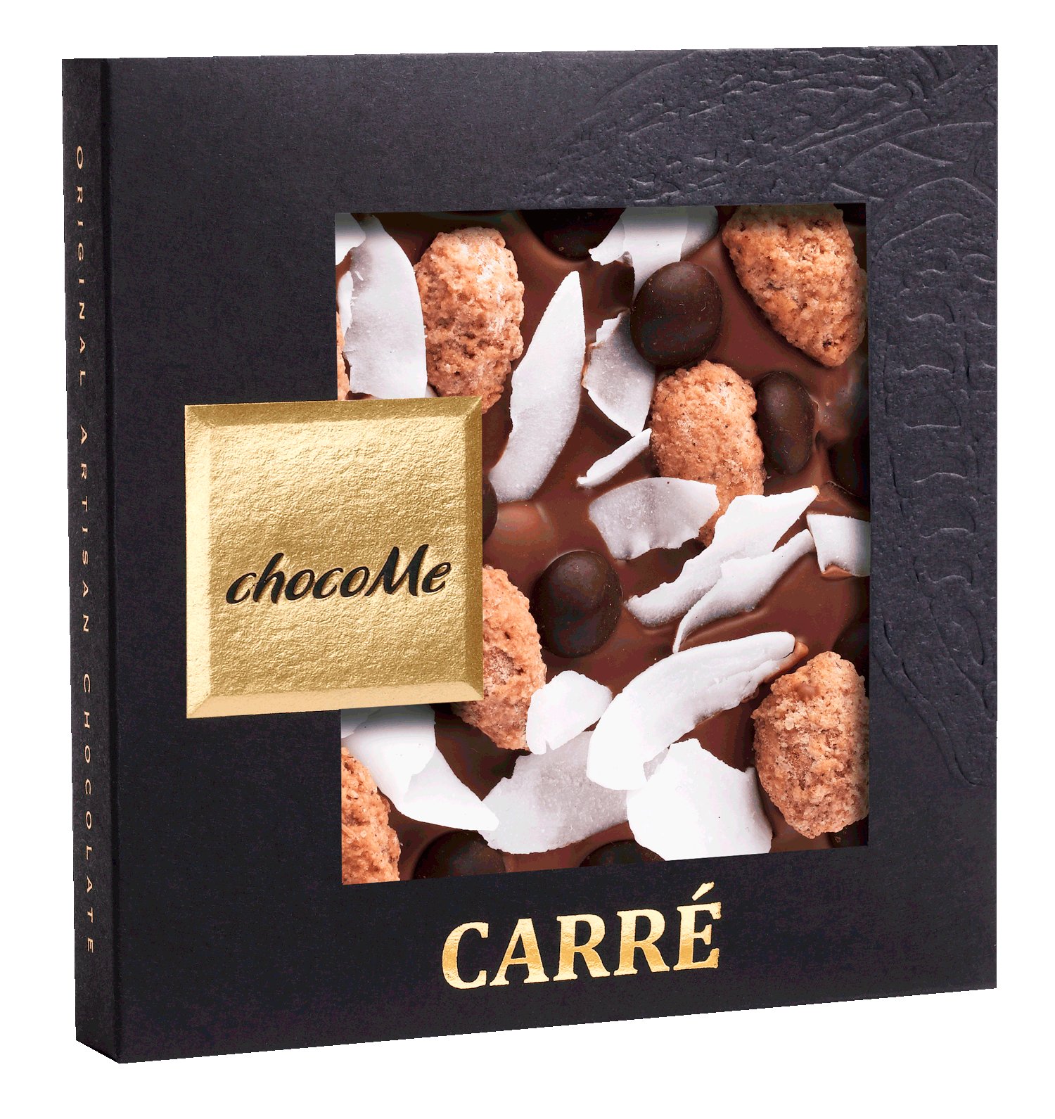 Mléčná čokoláda s mandlemi v cukru a skořici, kokosem a kousky hořké čokolády