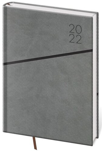 Desky diáře Grife jsou vyrobeny převážně z šedé matné a strukturované koženky. Šedá koženka je ozdobena barevným pruhem.