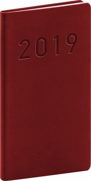Kapesní diář má elegantní vínový povrch imitující kůži.
