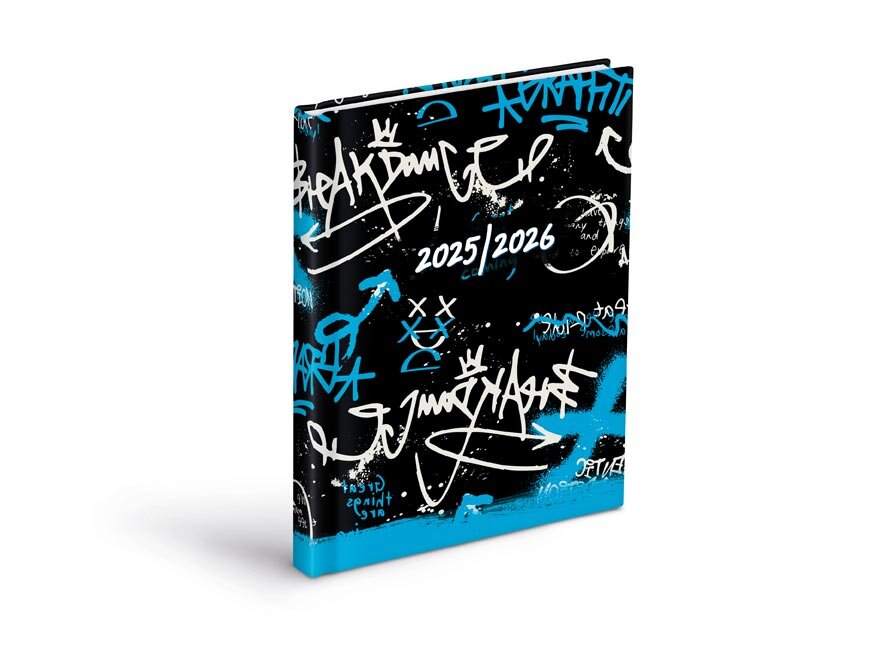 Wyrazisty studencki terminarz w formacie A6, którego nie pomylisz z innym. Dziki miks graffiti, tagów i niebiesko-czarnej energii przyciągnie uwagę i pokaże, że nie boisz się być widoczny. Idealny dla tych, którzy żyją według własnych zasad - i mają co planować.
