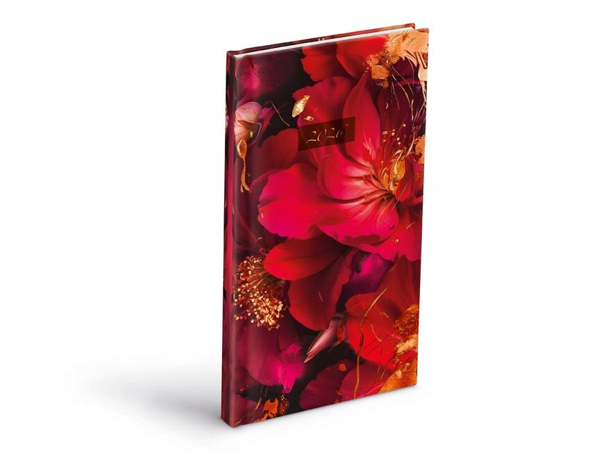 Odvážný design pro odvážné plány!Týdenní diář 2026 upoutá na první pohled svým sytým, intenzivním designem. Bohatý květinový motiv v odstínech červené, vínové a zlaté působí energicky, žensky a luxusně – ideální volba pro ty, kteří se nebojí výrazného stylu.Matné lamino v kombinaci s parciálním...