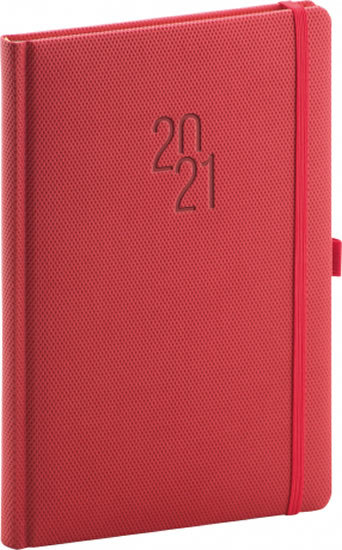 Klasicky červený týdenní diář Diamante 2021 ve formátu A5. Povrch s jemnou strukturou připomínající výbrus diamantu je vhodný pro všechny typy ražeb. Diář má zakulacené rohy, poutko na tužku a elastickou gumičku, sloužící k pevnému uzavření.
