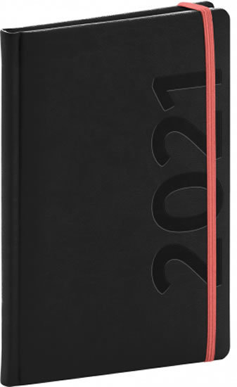 Černý týdenní diář Avilla pro rok 2021 s praktickou černou gumičkou na uzavření. Povrch diáře je imitace kůže, na který lze snadno razit i tisknout firemní loga s jemnou strukturou.