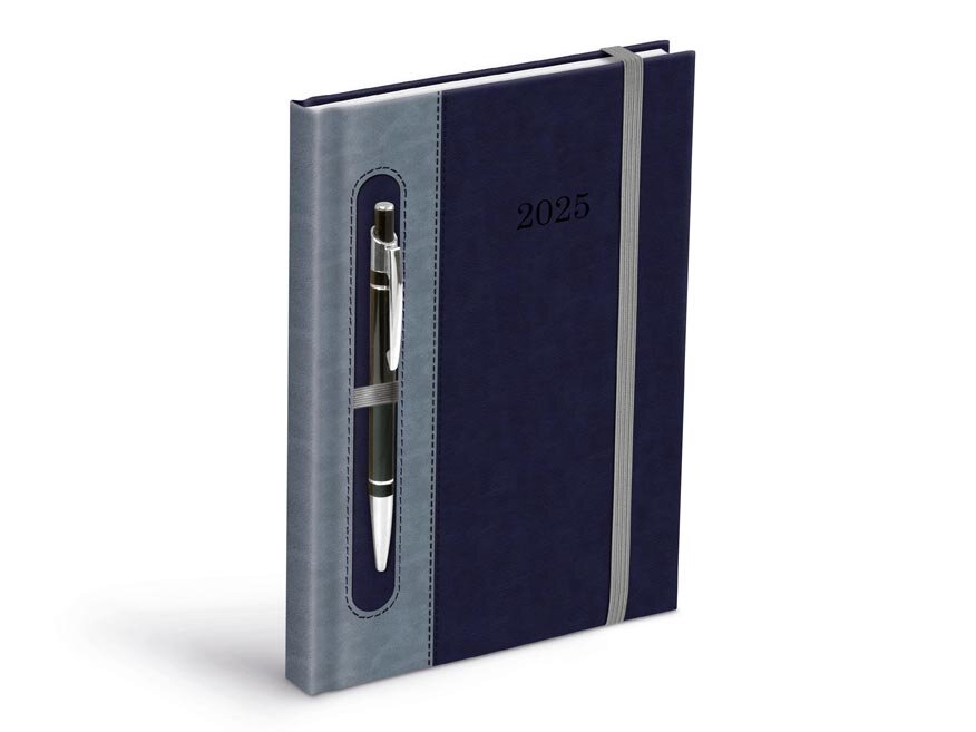 Denní diář pro rok 2025 ve formátu A5, v kombinaci tmavě modré a šedé barvy, s poutkem na propisku a uzavíráním na gumičku. Povrch obálky je vyroben z měkčeného materiálu příjemného na dotek. Je výborným pomocníkem pro organizování Vašeho času.DIÁŘ OBSAHUJE:- prostor pro osobní údaje- roční...