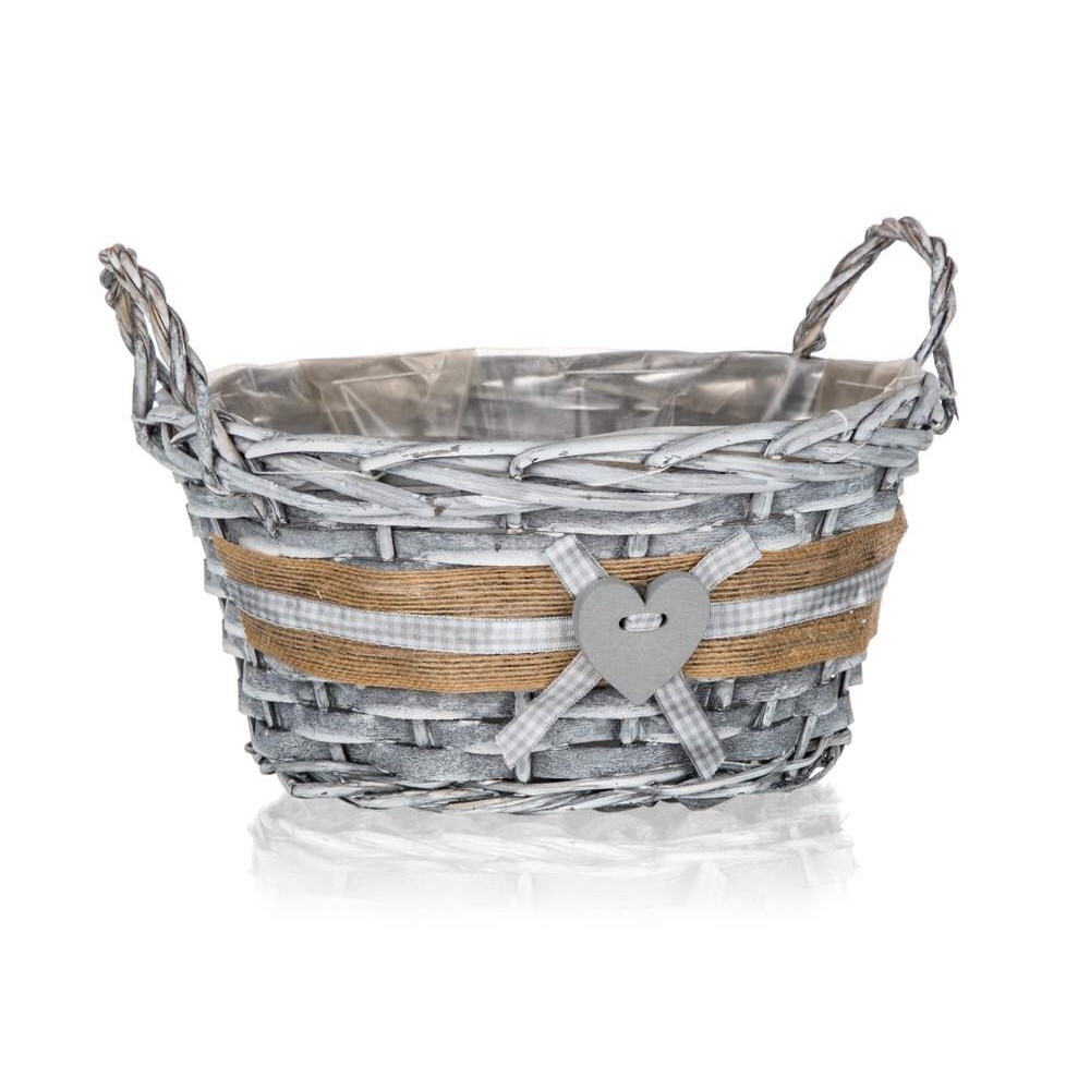 Koszyk wiklinowy z uchwytami o wymiarach 25x12 cm nadaje się wyłącznie do celów dekoracyjnych. Dostarczany w szarym kolorze, w kształcie okrągłym z dekoracją serca, w środku wyłożony folią. przeczytaj całość