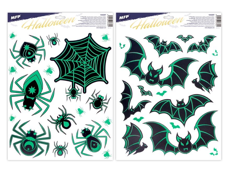 Świecąca folia okienna Halloween z motywem pająków i nietoperzy. Stworzy prawdziwą halloweenową atmosferę. Nadaje się na każdą gładką powierzchnię, na przykład szkło, witryny, lustra lub kafelki. Czysta, bez kleju i wielokrotnego użytku.