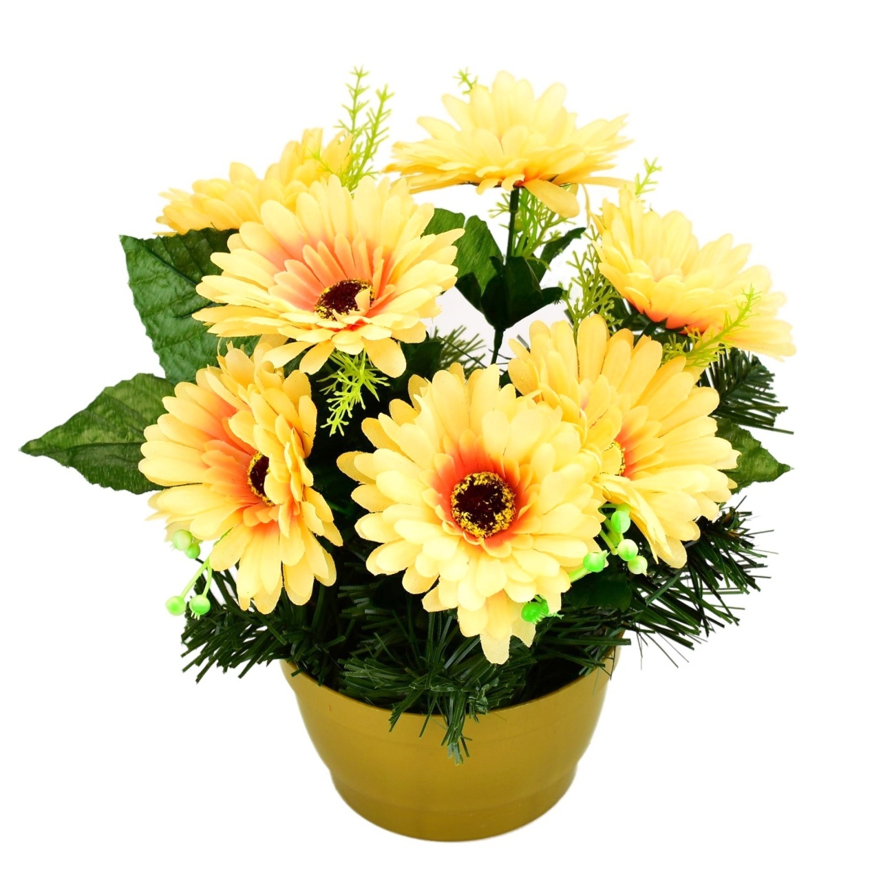 Miska se světle oranžovými gerberami 25×25 cm - Dekorativní miska se světle oranžovými gerberami je neodolatelnou dekorací pro Vaše prostory. - Stylový vývazek ze 7 květů gerber ve světle oranžové barvě dodá elegantní nádech každému interiéru. - Vyrobeno z kvalitních materiálů, jako je plast,...