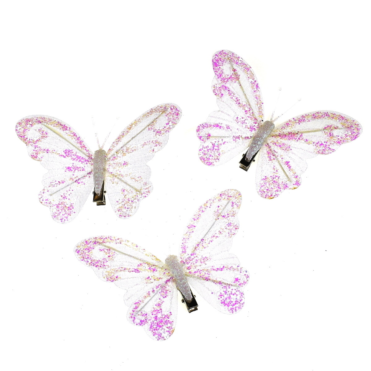 Tady máme skvělé motýlky se skřipcem! Vhodné jako dekorace na vánoční stromeček nebo kdekoli jinde, kam si je můžete přidělat. Tyhle krásné motýlky jsou bílo/růžové a zdobené nádherným duhovým glitrem. Nejenže skvěle vypadají, ale rozhodně přinesou do vašeho prostoru vlnu jiskření.Tyto motýlky...