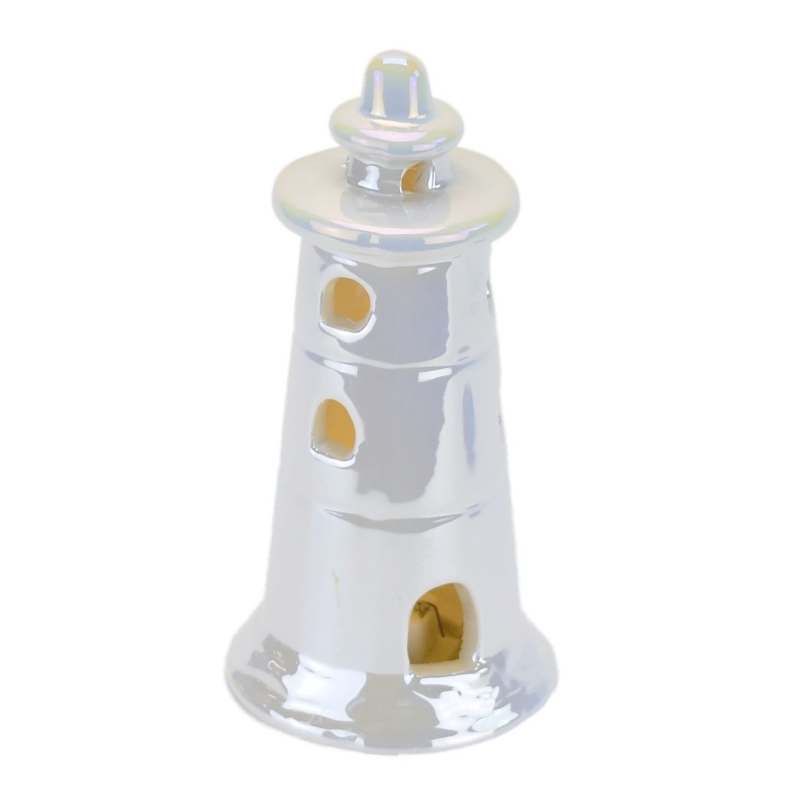Maják keramický s LED osvětlením, bílá perleť, 14 cm