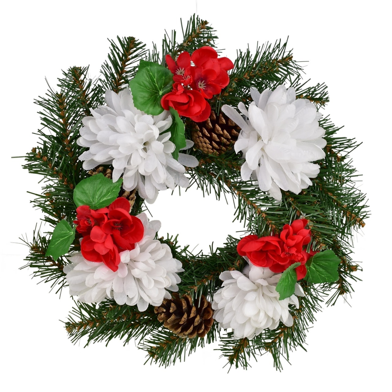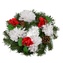 Wieniec z białymi chryzantemami o średnicy 27 cm to elegancka i gustowna dekoracja, idealna na uroczystości żałobne lub jako wieniec na grób. Wykonany jest ze sztucznego igliwia, co zapewnia jego długą trwałość i niezmieniony wygląd. Ten stylowy wieniec jest ozdobiony białymi chryzantemami i czerwonymi kwiatuszkami, które nadają całości delikatny i dostojny wygląd.