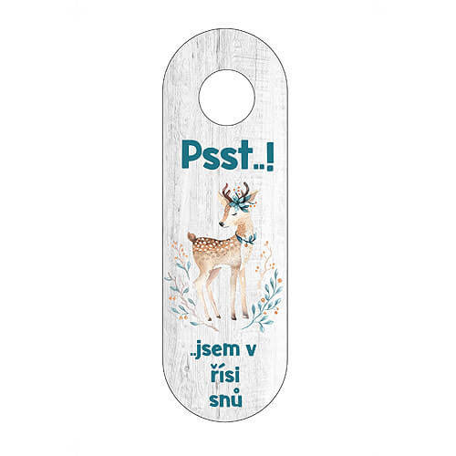 Dřevěný závěs na kliku pro děti a miminka - srnecCedulka na dveře pro děti, miminka a novorozence. Dárek pro při narození miminka, aby je nikdo nerušil při spánku. Originální nápis - Psst, jsem v říši snů.Materiál: překližkaRozměr: 26 x 8 cm  przeczytaj całość