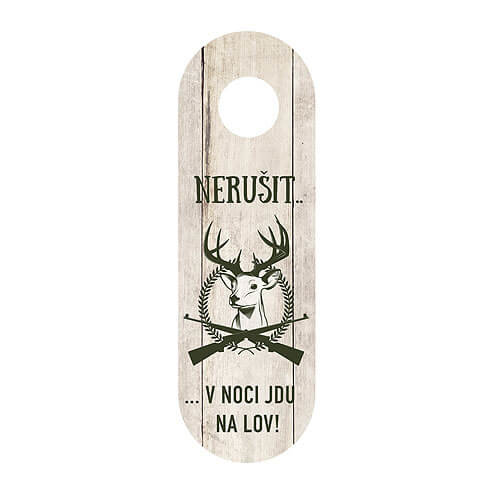 Dřevěný závěs na kliku - pro myslivceCedulka na dveře pro myslivce a lesníky, kteří nechtějí, aby je někdo rušil a budil, když jdou na lov. Originální nápis - Nerušit, v noci jdu na lov!Materiál: překližkaRozměr: 26 x 8 cm  przeczytaj całość