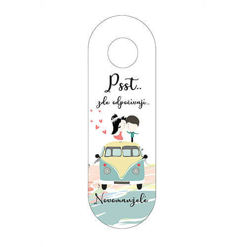 Dřevěný závěs na kliku pro novomanželeCedulka na dveře pro ženicha a nevěstu. Závěs na kliku pro novomanžele, aby je nikdo nerušil po svatební noci. Originální nápis - Psst, zde odpočívají novomanželé.Materiál: překližkaRozměr: 26 x 8 cm  przeczytaj całość