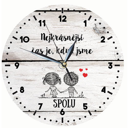 Dřevěné hodiny s potiskem - nejkrásnější čas je, když jsme spoluDřevěné hodiny s potiskem - nejkrásnější čas je, když jsme spolu - jsou krásným dárek z lásky pro zamilované k Valentýnu nebo jako drobný svatební dar pro novomanžele. Hodiny je možné zavěsit do kuchyně nebo pokoje.Materiál:...