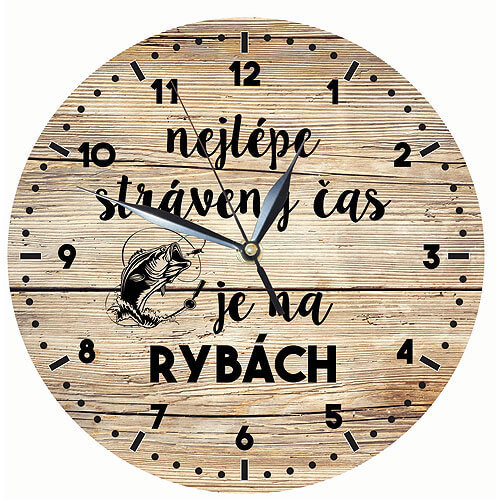 Dřevěné hodiny s potiskem pro rybářeDřevěné hodiny s potiskem - nejlépe strávený čas je na rybách - jsou krásným dárek pro rybáře, aby věděl, kdy je správný čas jít na ryby. Hodiny je možné zavěsit do kuchyně, kanceláře nebo pracovny.Materiál: překližka s potiskem, průměr hodin je 24 cm a šířka...
