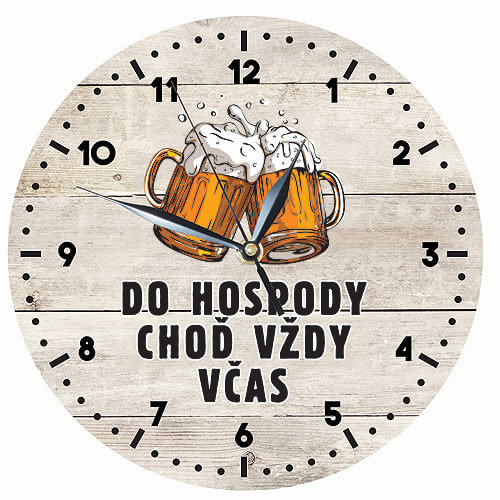Dřevěné hodiny s potiskem - do hospody choď vždy včasDřevěné hodiny s potiskem - do hospody choď vždy včas - jsou krásným dárek pro muže. Hodiny je možné zavěsit do kanceláře nebo pracovny.Materiál: překližka s potiskem, průměr hodin je 24 cm a šířka materiálu je 3 mm. Hodinový strojek - 3...