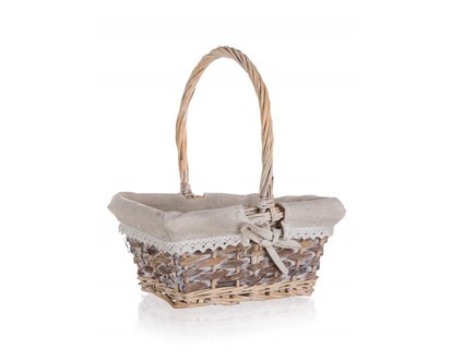 Košík proutěný s držadlem DUO o rozměru 22,5 x 19 x 10,5 cm je vhodný pouze pro dekorativní účely. Dodáván v hnědobílé barvě obdelníkohévo tvaru, uvnitř přírodní látka s krajkovým lemem. przeczytaj całość