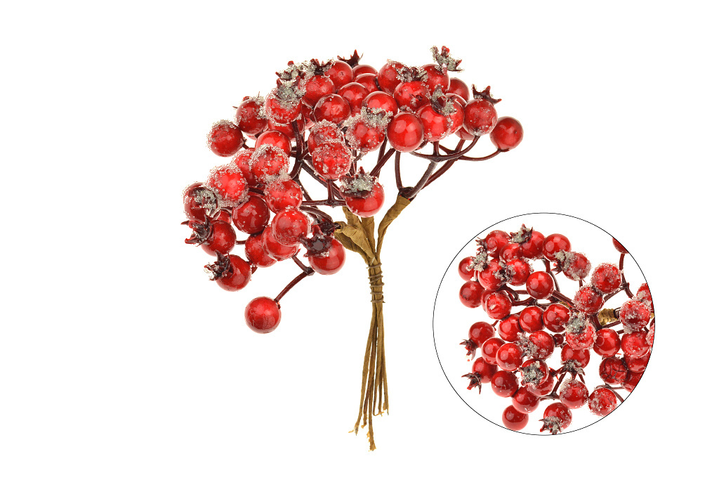 Dekorace napodobující trs plodů jeřabiny patří mezi základní prvky pro výrobu dekorací. Jednotlivé trsy jeřabin jsou spojené plastovými stonky, které jsou na konci spojeny dohromady floristickým drátkem. Svazek se skládá ze 6 ks větviček, které jsou dále rozvětveny a obsypány plody.Výška vetviček...