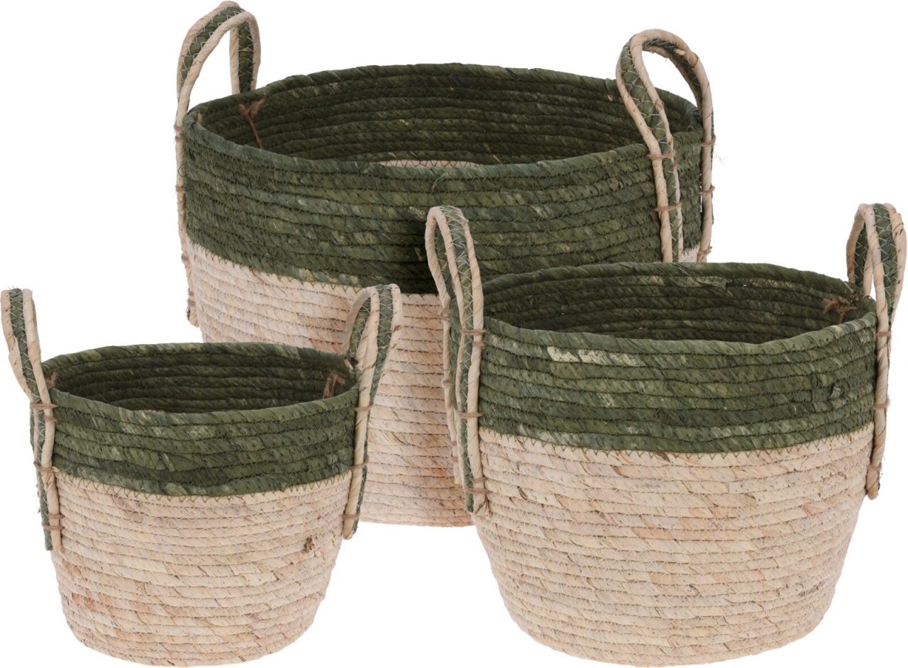 Sada 3 ks přírodních pletených košíků se zeleným okrajem a uchy.Materiál: přírdní listíRozměry:velkývýška 34 cmprůměr 34 cmstřednívýška 30 cmprůměr 30 cmmalývýška 27 cmprůměr 27 cm przeczytaj całość