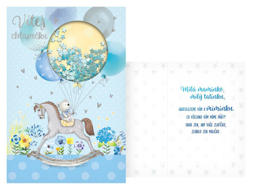 Přání k narození miminka - Narození miminka je veliká událost a je třeba ji oslavit. Pošlete novopečené mamince a tatínkovi blahopřání, které je zajisté potěší, a které jim bude připomínat radostné narození jejich miminka.Text na přední straně přání:Vítej chlapečkuText uvnitř přání:Milá maminko,...