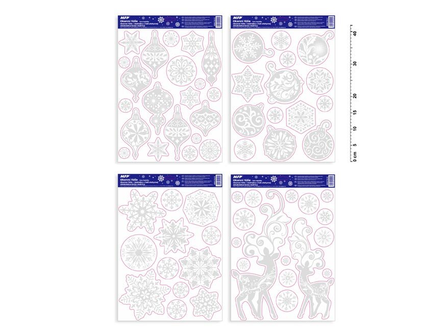 Okenní fólie vánoční ozdoby v bílé barvě s glitrem. Vyzdobte si okno těmito krásnými samolepkami na okno. Vytvoří Vám kouzelnou atmosféru domova.
