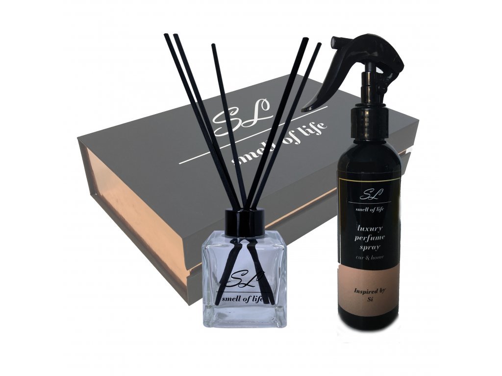 Dárková sada vonného difuzéru a parfému pro byt/auto ve formě rozprašovače inspirovaných vůní parfému SÍ v luxusní černé krabičce s růžovým zlatem je ideálním dárkem pro ženu.  przeczytaj całość
