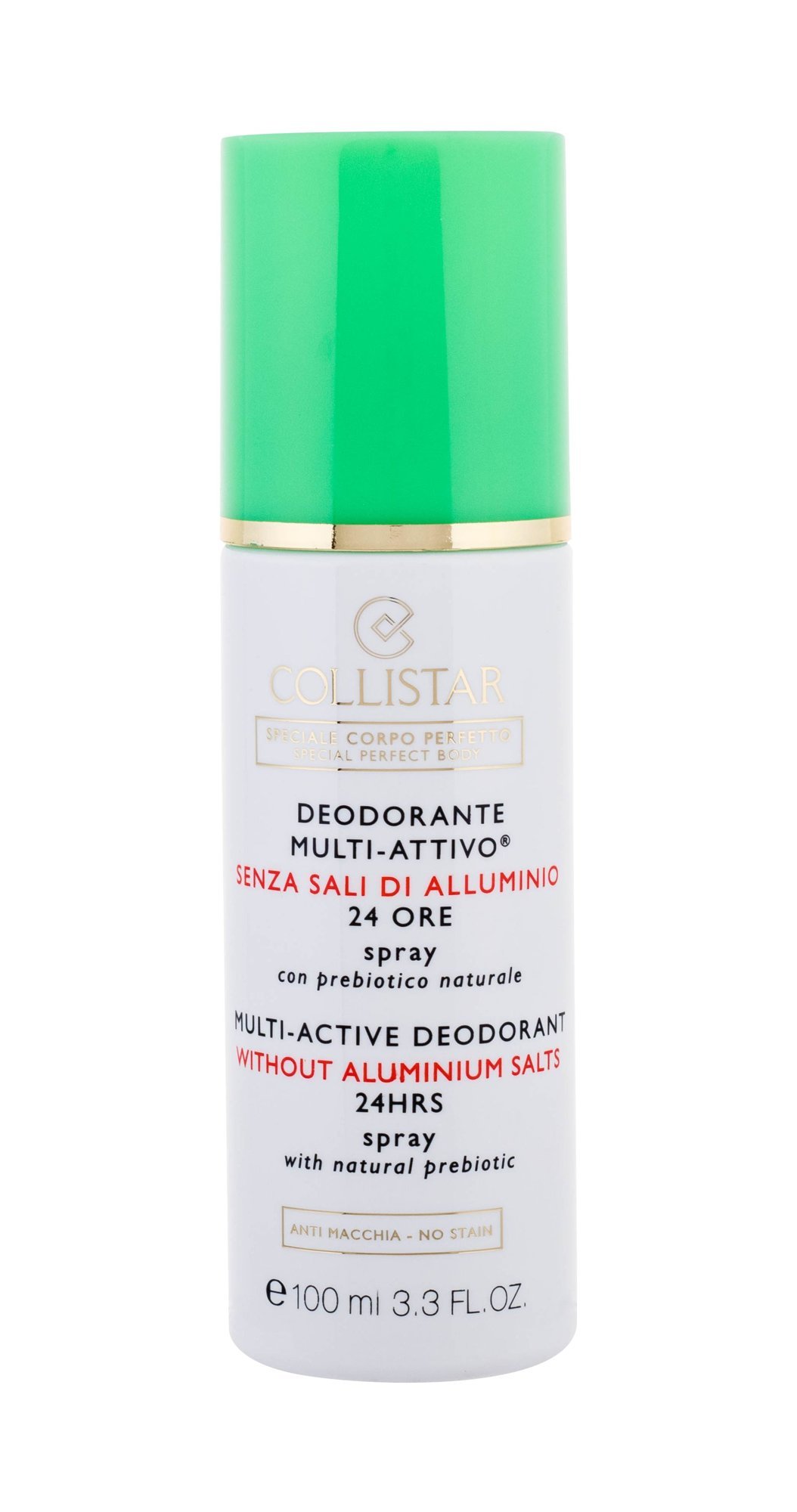Deodorant ve spreji bez hliníkových solí Collistar Multi Active Deodorant 24h je obohacen o speciální bavlněné vlákna z ultrajemných mikročástic pro zvýšenou absorbci. Rychle zasychá, takže pleť je svěží, jemná a hedvábná. Zároveň pokožku zklidňuje, zabraňuje podráždění a má antibakteriální účinky.