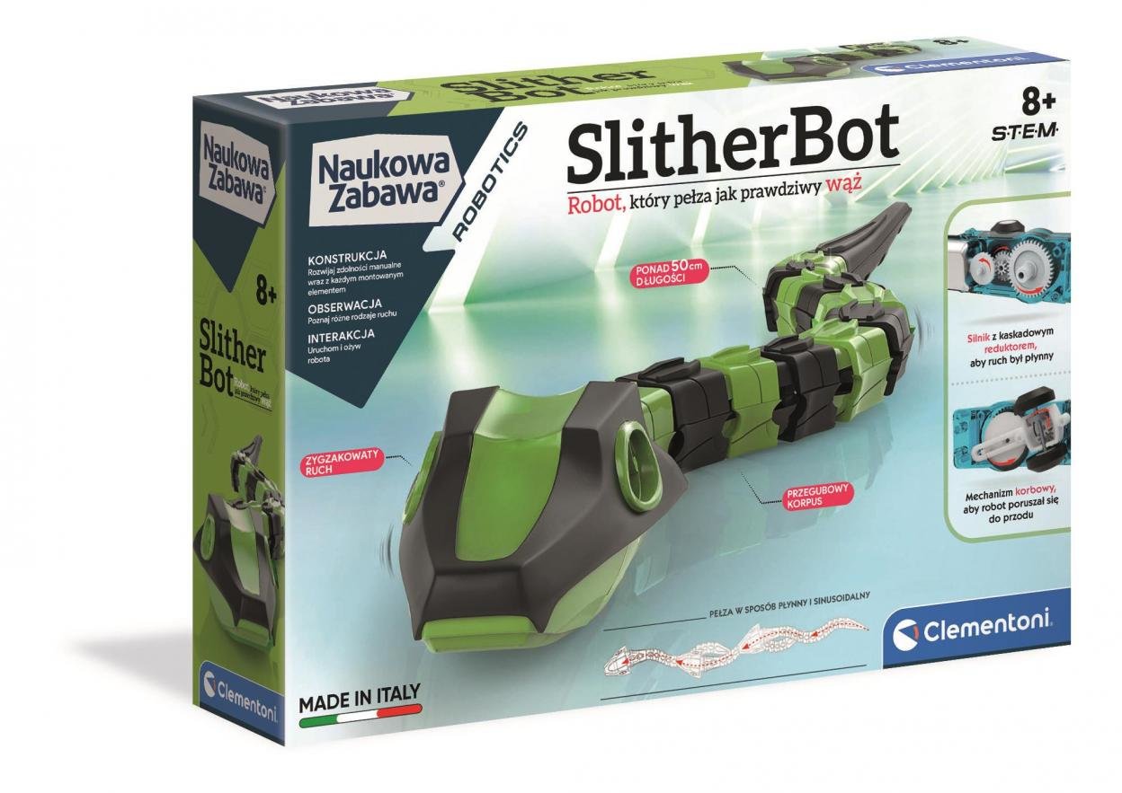 SlitherBot to 40 cm długi wąż złożony z 12 połączonych segmentów, które umożliwiają płynny, sinusoidalny ruch podobny do ruchu prawdziwego węża. Po włączeniu zaczyna powoli pełzać po pomieszczeniu, wślizgując się w wąskie przestrzenie i kąty, tworząc autentyczne doświadczenie zarówno dla dzieci, jak i dorosłych, którzy docenią połączenie technologii i zabawy.