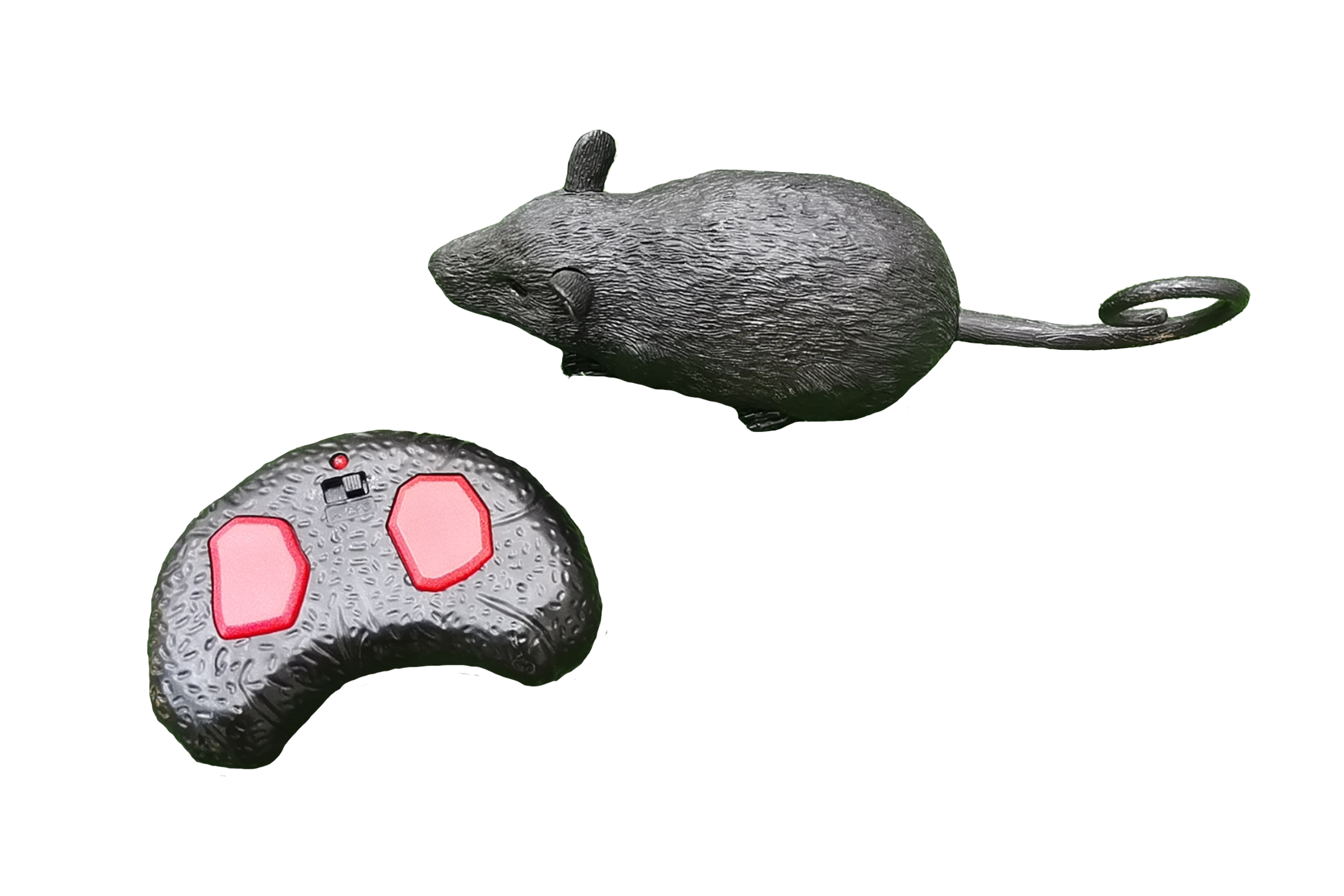Krysa RC na dálkové ovládání. Velikost 22 cm. Infračervený port, kanál A,B,C. Světelné a zvukové efekty. 2xAAA baterie do krysy, 3xAAA do ovladače nejsou součástí. Přepínač ON/OFF na spodní straně krysy. Levé tlačítko - pohyb dopředu, pravé tlačítko - otáčení. Podržením obou tlačítek po dobu 7 vteřin - demo funkce, přerušení levým tlačítkem. Manuální otevírací tlama.