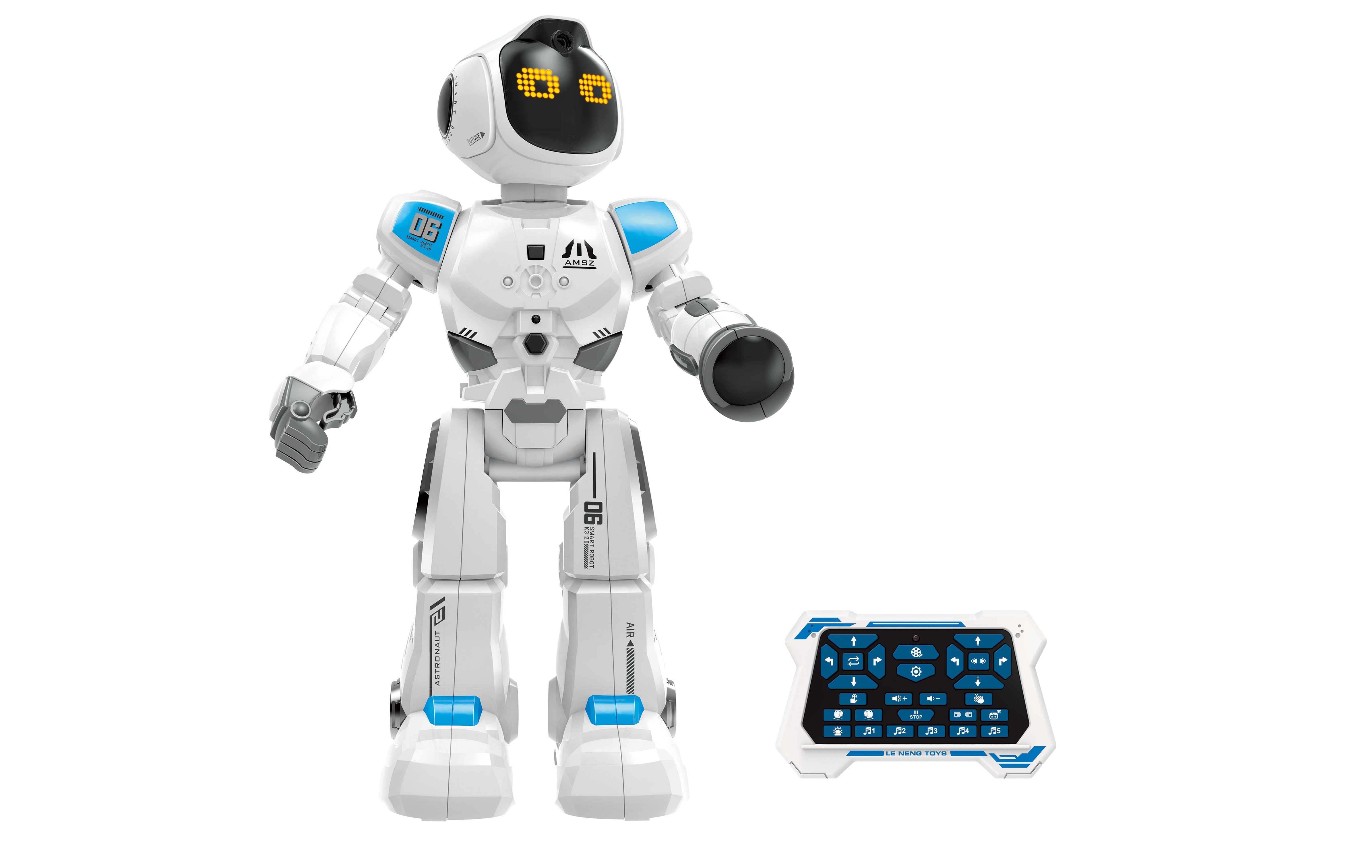 Robot RC na dálkové ovládání. Rozměry 21x11x38 cm. Světelné a zvukové efekty. Bateriový pack 3.7V 600mAh do robota součástí, 2xAA do ovladač nejsou součástí. Funkce - demo, chůze, tanec, otáčení hlavy, ovládání hlasitosti, hudba, ovládání potleskem i dotekem, programování, měnící se výrazy tváře, robotí jazyk. USB kabel součástí. Přepínač ON/OFF na zádech robota.