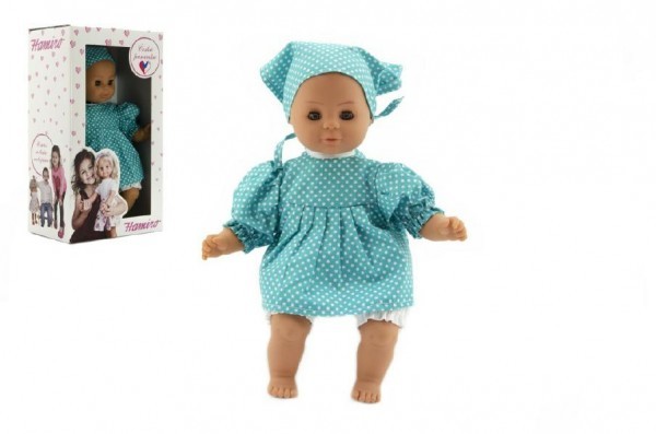 Panenka/Miminko Hamiro 30cm, látkové tělo šaty modré+ bílý puntík + šátek v krabici 20x35x13cm