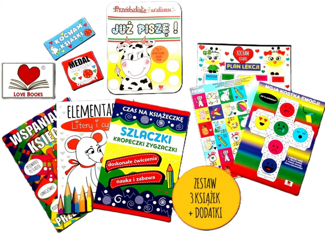 PRZEDSZKOLE W DOMU. JUŻ PISZĘ ! ZESTAW 3 KSIĄŻEK Z DODATKAMI Super zestaw 3 książek dla dzieci w wieku przedszkolnym. W zestawie następujące książki: WSPANIAŁA KSIĘGA PRZEDSZKOLAKA ELEMENTARZ LITERY I CYFRY SZLACZKI KROPECZKI ZYGZACZKI W zestawie dodatkowo znajdują się naklejki, gra Piotruś do...