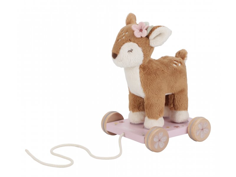Ta pluszowa sarenka jest przymocowana do praktycznego wózka na kółkach, który dziecko łatwo ciągnie za sobą za pomocą wytrzymałego sznurka. Sarenkę można łatwo odpiąć na rzepy i bawić się nią także osobno. Zabawka pochodzi z designerskiej kolekcji Little Dutch Fairy Garden, inspirowanej pięknem i urokiem życia w ogrodzie.