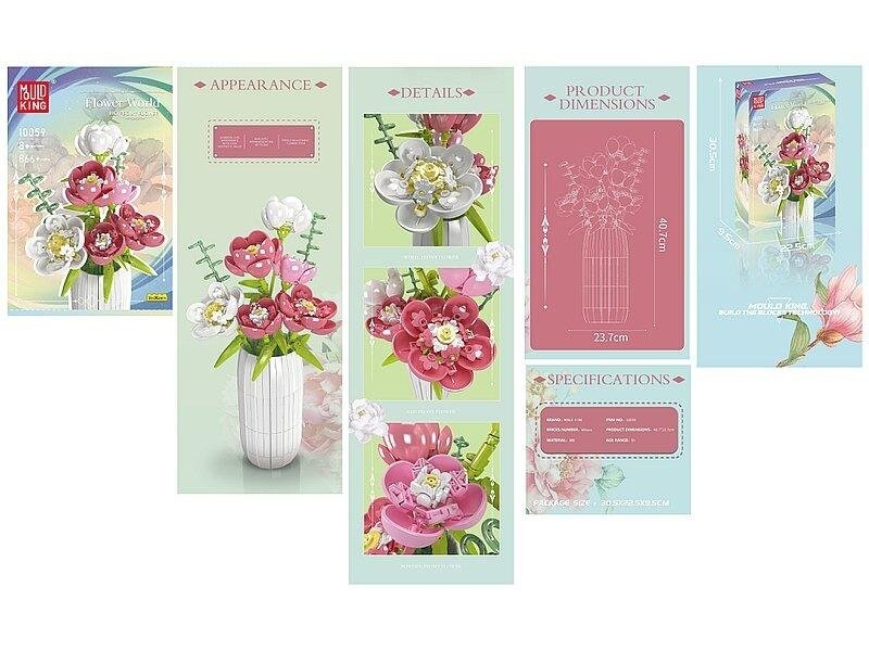 zestaw klocków 866szt, kwiaty w wazonie, wym.rozłożonego 40,7x23,7cm; 19,7x10,4x9cm, Box przeczytaj całość