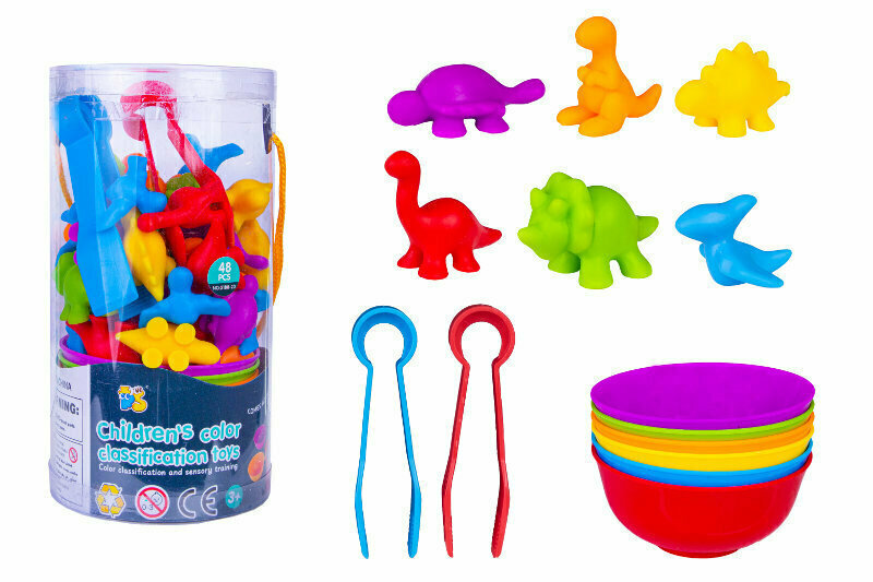 Zestaw do nauki kolorów i liczenia. W przezroczystej tubie umieszczono mnóstwo różnych dinozaurów w odmiennych kolorach. Dzięki obecności różnokolorowych miseczek oraz narzędzi do chwytania zwierzątek możemy uczyć dziecko dopasowywania kolorów i liczenia (poprzez umieszczanie zwierzątka w...