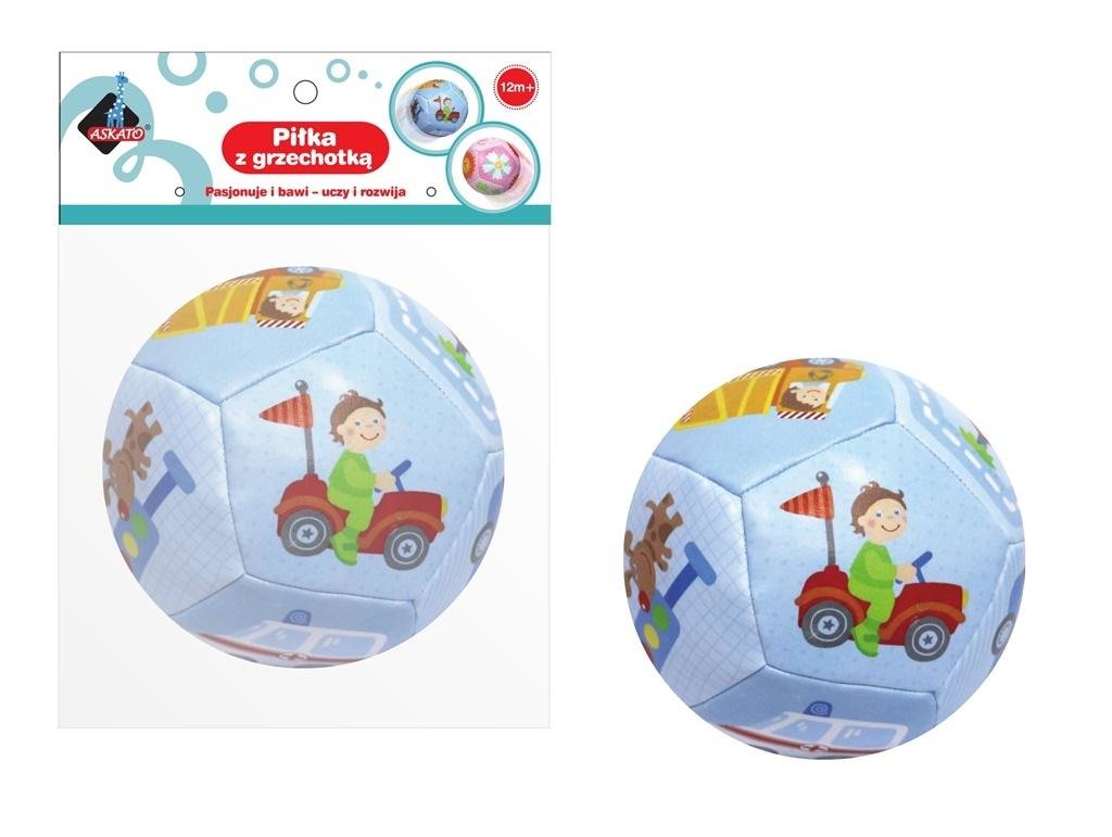 Miękka piłka (średnica 13 cm) z wszytą grzechotką. Wersja dla chłopców - niebieska. przeczytaj całość