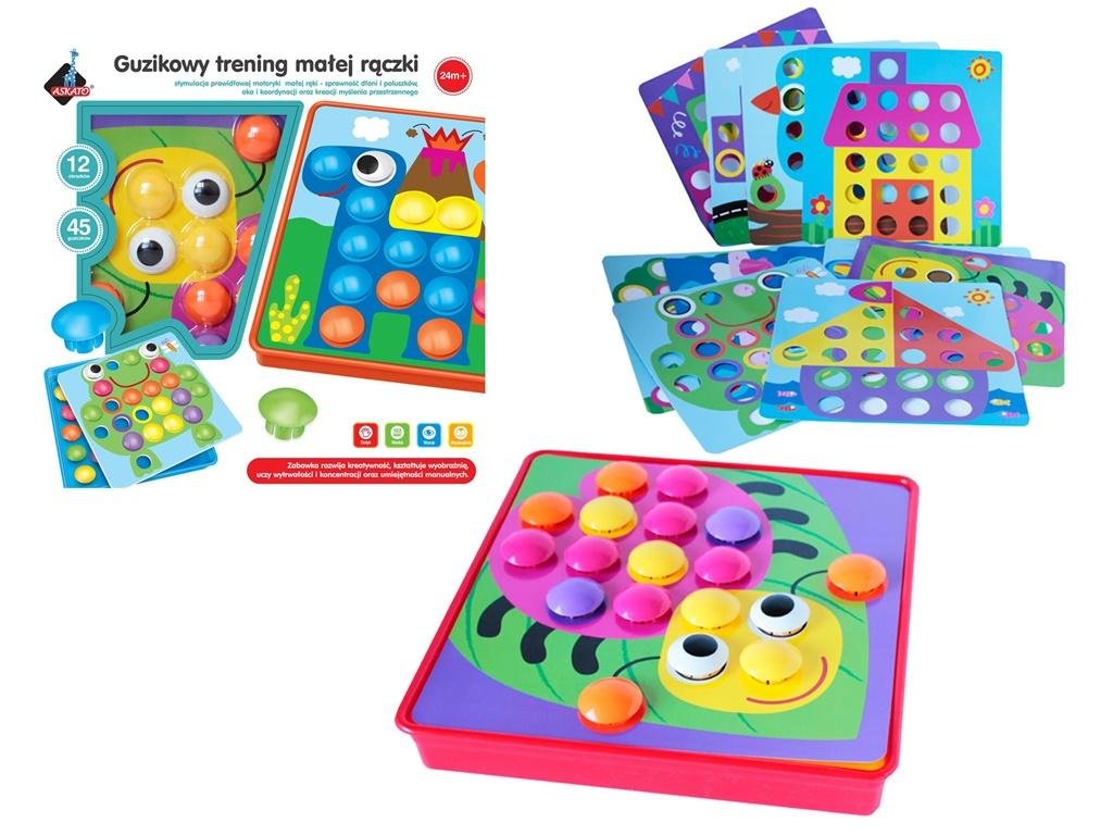 Zabawka zawiera 45 dużych guziczków oraz 12 wymiennych plansz. przeczytaj całość