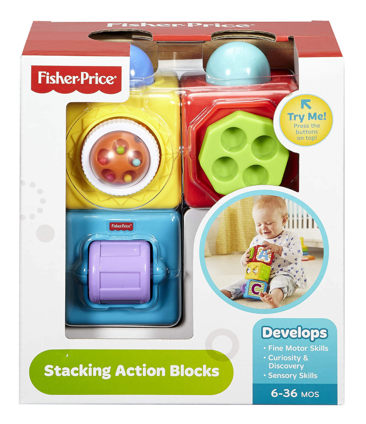 S akčními kostkami od Fisher-Price zažije vaše dítě spoustu zábavy a legrace. Na každé ze 4 stran každé kostky nalezne děťátko 1 zábavnou hru: Učení písmenek, učení číslic, hru na jukanou a další zábavnou hru. V modré akční kostce se protáčí malý bubínek, v červené akční kostce je otáčivá kulička...
