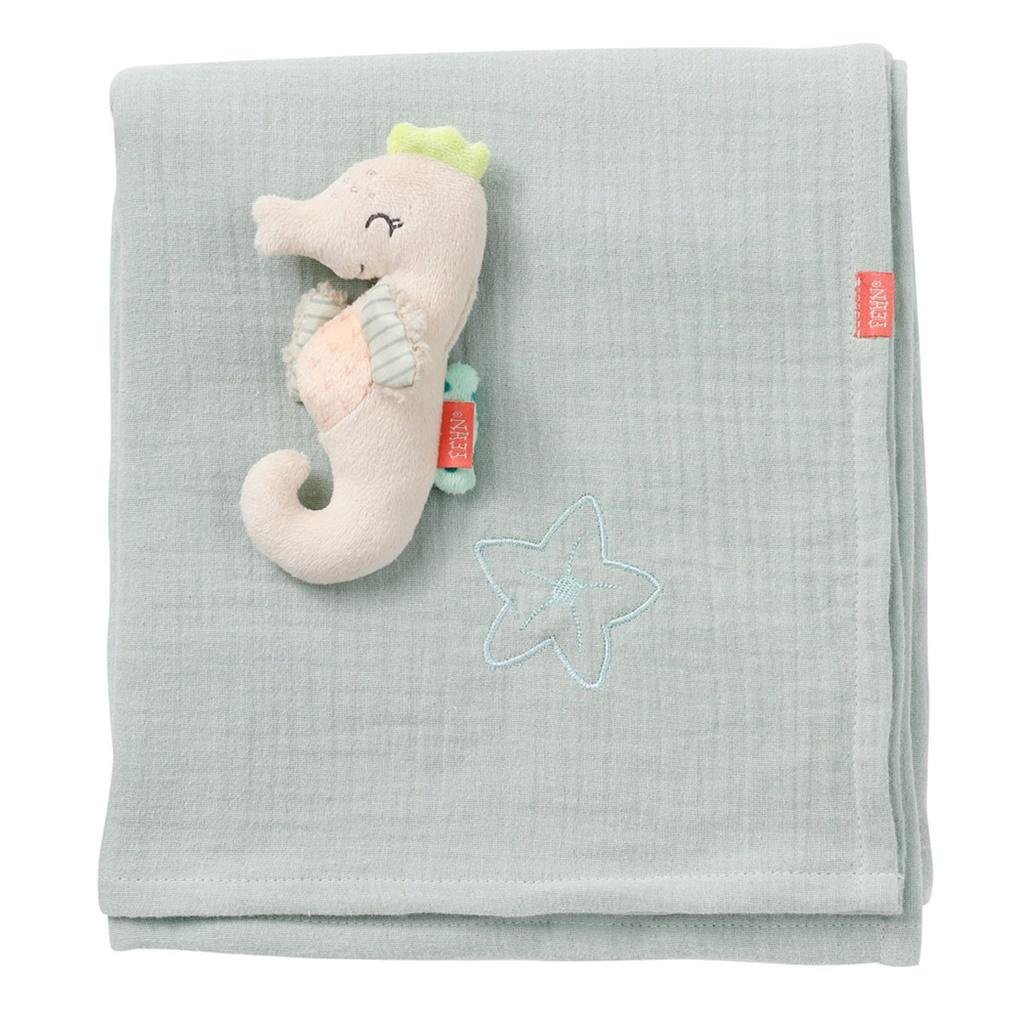 Kocyk Muślinowy, Konik Morski z Kolekcji: Morze Niezwykle delikatny w dotyku, miękki kocyk z muślinu będzie pełnił rolę najlepszego przyjaciela, pocieszyciela, bratniej duszy i opiekuna. Można go używać jako dywanik, podkładkę do raczkowania, okrycie lub wyściółkę do łóżeczka, kojca, nosidełka...