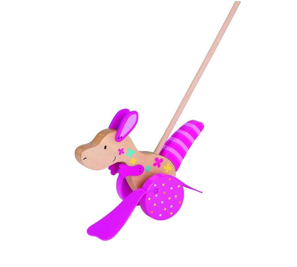 Drewniana zabawka - zwierzątko do pchania. Zabawka rozwija koordynację ruchową, uczy rozpoznawania zwierząt i kolorów. Największą radość sprawia dzieciom pomiędzy 1,5 a 2. rokiem życia. przeczytaj całość