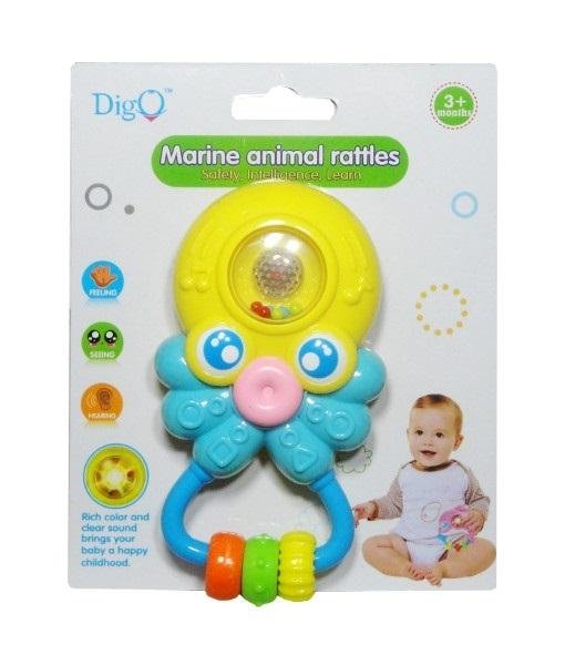 Urocza grzechotka dla dzieci w kształcie ośmiornicy. Grzechotka posiada ruchome elementy (3 kolorowe kółeczka o różnej fakturze co oddziałuje na zmysł dotyku, kolorowe kulki wewnątrz działają na zmysł słuchu, jak również zabawka świeci kolorowym światełkiem. przeczytaj całość