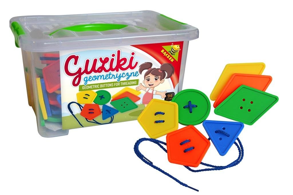 Zestaw kolorowych guzików w kształcie figur geometrycznych zawierający 94 elementy. Dziecko z pomocą guzików uczy się rozpoznawać figury geometryczne takie jak trójkąt, kwadrat, koło, romb, pięciokąt oraz sześciokąt a układając je na płaszczyźnie może tworzyć dowolne obrazy. Dodatkowo w zestawie...