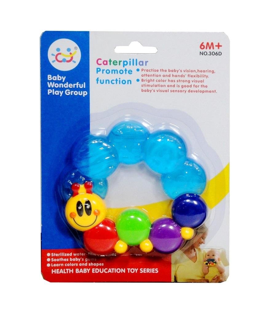 Zabawka gryzak dla dzieci. Widnieje na nim urocza gąsieniczka. Część gryzaka jest wypełniona wodą. Zabawka zapakowana jest w kartonową podstawkę z przezroczystym kloszem. Produkt dla dzieci w wieku 6 miesięcy. przeczytaj całość
