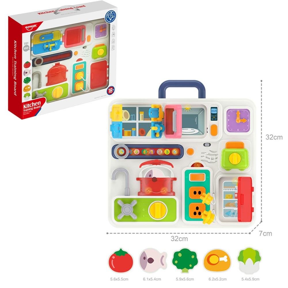Kuchnia dla maluchów - tablica manipulacyjna Ruchome elementy do otwierania, przekręcania, dopasowywania, które usprawniają motorykę małej rączki i paluszków. Dodatkowo efekty świetlne i dźwiękowe urozmaicają zabawę. 5 plastikowych kształtów - pomidor, ryba, mięsko, brokuł, sałata wygodna rączka...