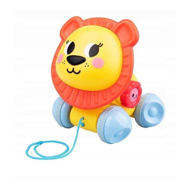 "Cztery kółka, ruda grzywa, a do tego głową kiwa! Ten wesoły zwierzak zabawi najmłodszych na kilka różnych sposobów. Można go prowadzić na sznureczku, aby jechał, zabawnie kręcąc przy tym głową. Lew posiada specjalne kółeczka o nieregularnym kształcie, co zapewnia ciekawy efekt wizualny....