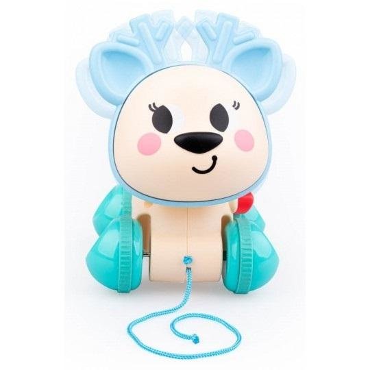 "Uroczy jelonek aż kołysze się do zabawy! Posiada sznureczek do prowadzenia i cztery kółeczkao nieregularnym kształcie, co zapewnia ciekawy efekt wizualny. Dodatkowo, można je rozpędzić, aby postawiony na podłodze zwierzak pojechał samodzielnie do przodu. Podczas jazdy, zabawka wesoło kręci...
